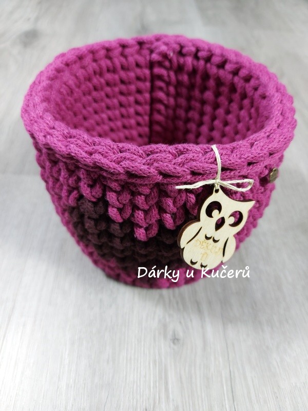 Ručně háčkovaný košík, dno je z překližky 3mm a Ø13cm.