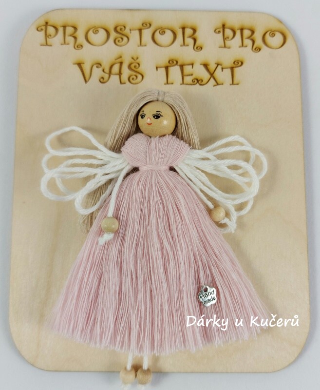 Ručně vyrobená macramé andělka, každá je originál, může se proto velmi minimálně lišit od fotografie. Rozměr destičky z překližky 3mm je 15x12cm. Andělka je k překližce přivázaná vlascem, a má ve vláskách vlasec na pověšení.