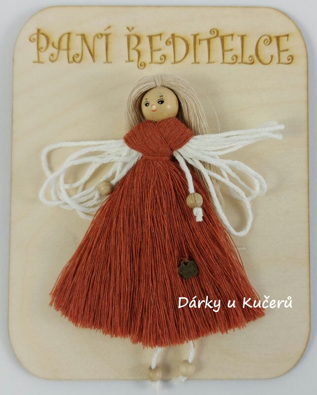 Ručně vyrobená macramé andělka, každá je originál, může se proto velmi minimálně lišit od fotografie. Rozměr destičky z překližky 3mm je 15x12cm. Andělka je k překližce přivázaná vlascem, a má ve vláskách vlasec na pověšení.